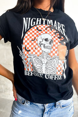 Black Nightmare Before Coffee Skull Checkerboard Graphic Halloween Tee